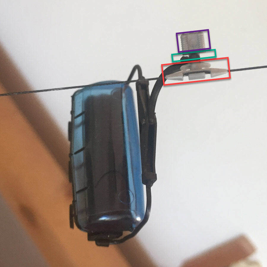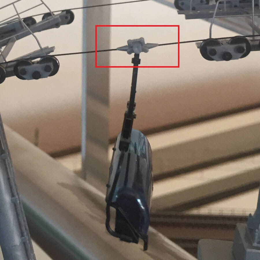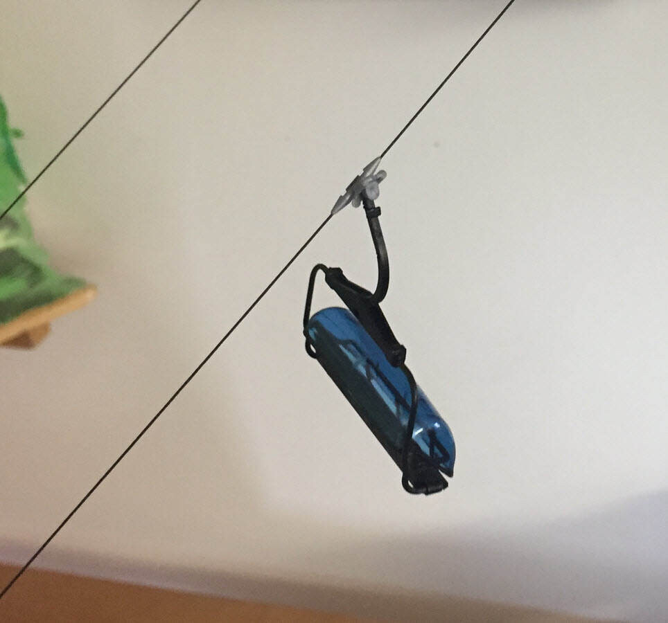 Die Klemmeeinheit besteht aus drei Teilen. Rot: Ist die Seilklemme, welche als erstes am Seil eingehängt werden muss. Grün: Ist der Sessel befestigt, muss an die Seilklemmen gesteckt werden Violett: Muss zuletzt angesteckt werden, damit der Sessel hält. Dies ist relativ heikel und muss gut gesteckt sein. Ideal wäre ein tropfen Leim, wass aber wegen der Beweglichkeit des Sessel nicht möglich ist. Damit würde er die Neigungen nicht ausgleichen, was die Sessel sehr schön machen.